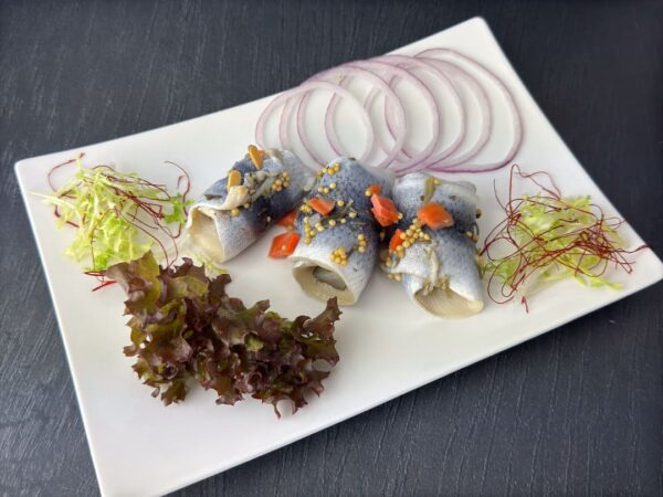 Zarte Heringsfilets, gefüllt mit Gewürzgurke und klassisch gerollt.