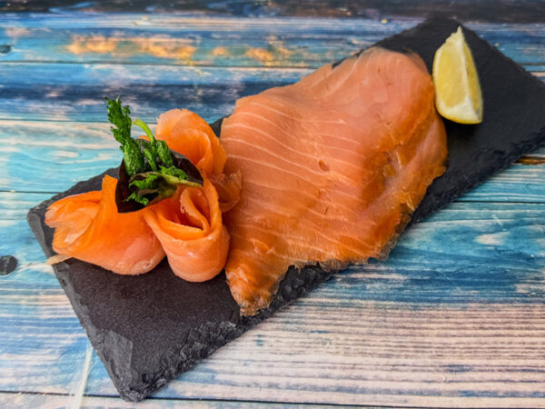 Dieser Clare-Island-Räucherlachs ist angenehm mild, gleichmäßig im Fleisch und vielseitig verwendbar – ob auf Brot, zum Frühstück oder auf einer Fischplatte.
