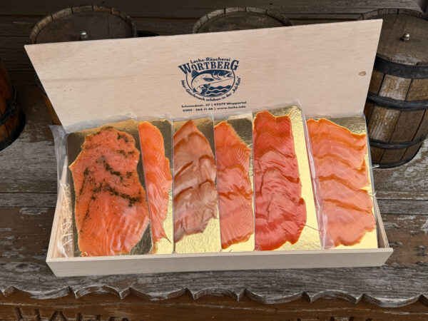 - Wortbergs Kanadischer Wildräucherlachs – intensiv im Geschmack, traditionell auf Buchenholz kaltgeräuchert.