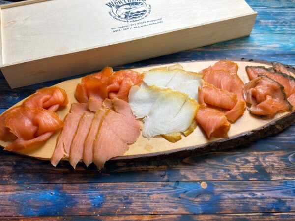 Das Präsent „Lachs trifft Butt“ vereint sechs fein geschnittene Räucherfisch-Spezialitäten aus eigener Räucherei.