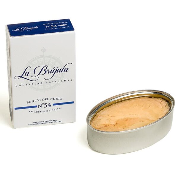 Thunfisch in Olivenöl No.54 von La Brújula wird aus Bonito del Norte hergestellt, einer besonders geschätzten Thunfischart aus dem Nordatlantik. Der Fisch wird im Golf von Biskaya gefangen und anschließend sorgfältig verarbeitet.